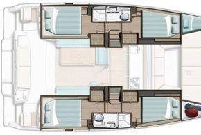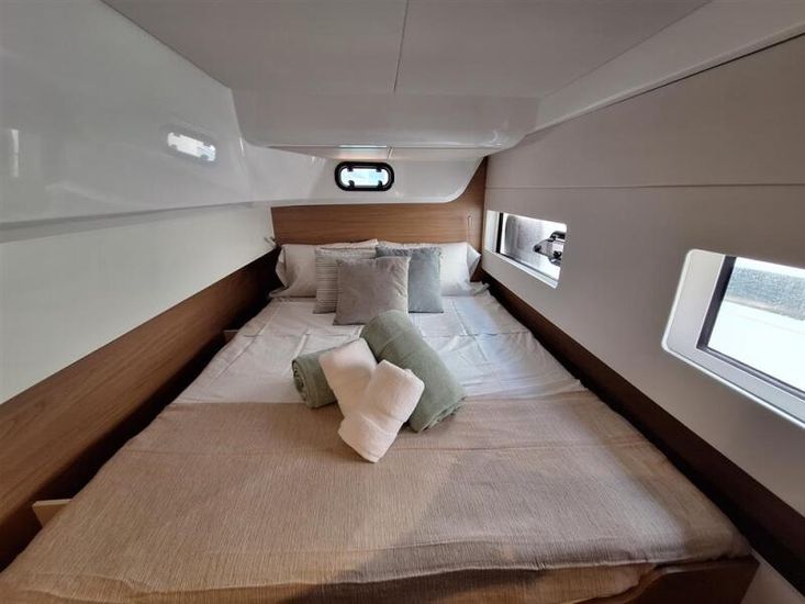 This 2024 Bali Catsmart is powered by upgraded option twin Nanni 30hp engines with sail drives and folding 3-blade propellers, offering economical cruising and seamless manoeuvrability. Below decks, accommodation is generous with four double guest cabins and two bathrooms featuring electric toilets and enclosed shower cubicles.