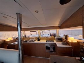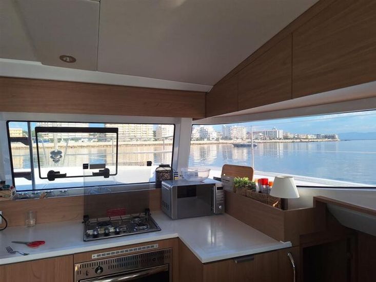 The raised open plan saloon and galley on this Bali Catspace offers stunning panoramic views and a seamless connection to the exterior spaces through Bali's signature tilting patio door.