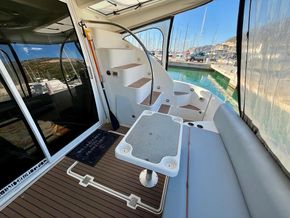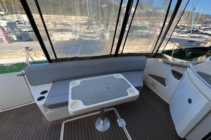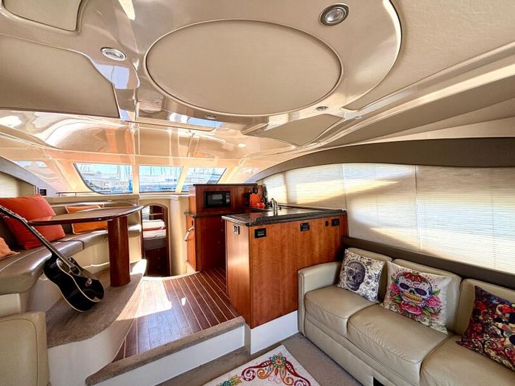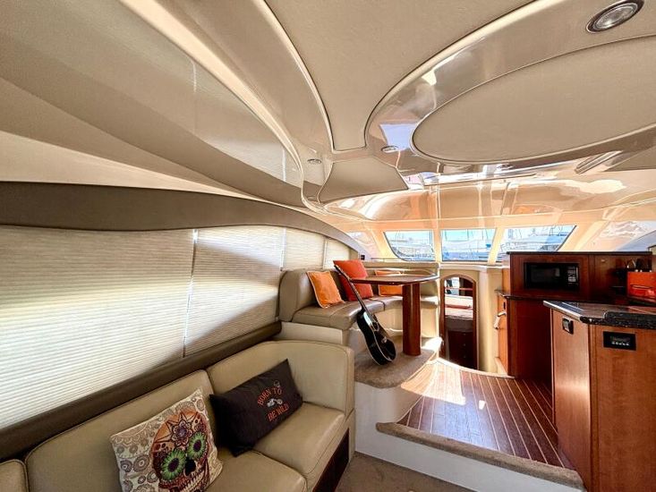 El interior del 447 Sedan demuestra un uso magistral del espacio y materiales de primera calidad, creando una atmósfera de lujo discreto. Al entrar en el salón principal, los invitados son recibidos por una zona de estar de planta abierta, bañada por la luz natural que entra a través de los grandes ventanales panorámicos. Los acabados en rica teka, el mobiliario de alta gama y una iluminación cuidadosamente integrada generan un ambiente cálido y acogedor. El salón conecta de forma fluida con la cocina y el comedor, garantizando que los espacios sociales del yate sean tanto funcionales como elegantes. La cocina está equipada con placas de inducción, microondas, 3 frigoríficos y 1 congelador. La altura interior alcanza hasta 2,10 m. La embarcación dispone de aire acondicionado y de un nuevo sistema de sonido Fusion con subwoofer y 11 altavoces distribuidos por todo el barco.