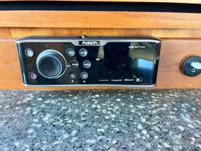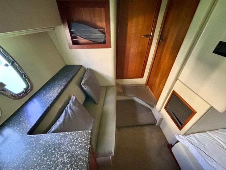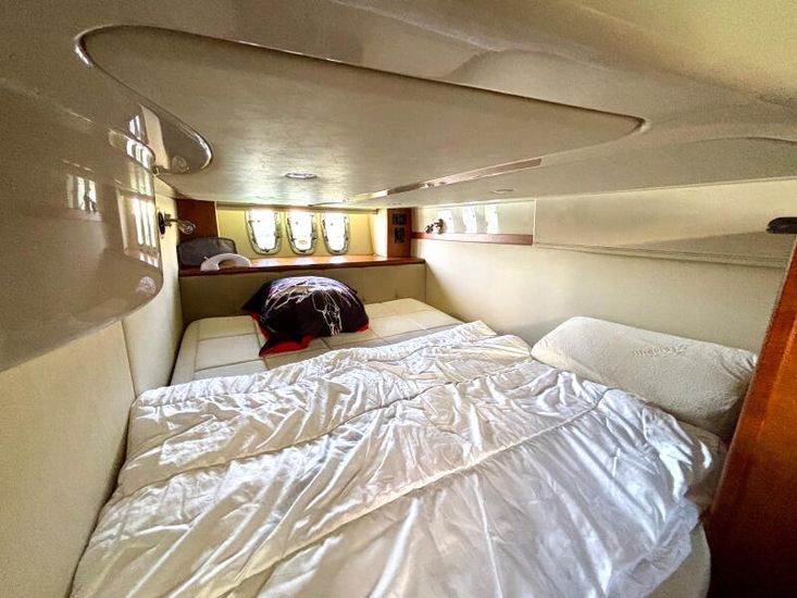 The interior of the 447 Sedan showcases a masterful use of space and premium materials, creating an atmosphere of understated luxury. Upon entering the main salon, guests are greeted by an open-plan living area, bathed in natural light from large, panoramic windows. Rich teak finishes, plush furnishings, and well-placed lighting create a warm and inviting ambience. The salon seamlessly connects to the galley and dining area, ensuring that the yacht’s social spaces are functional and stylish. The kitchen is equipped with induction cookers, a microwave oven, 3 fridges and 1 freezer. The height inside can reach up to 2,10 metres. The vessel has air conditioning and a new Fusion Subwoofer Stereo with 11 speakers all over the boat.